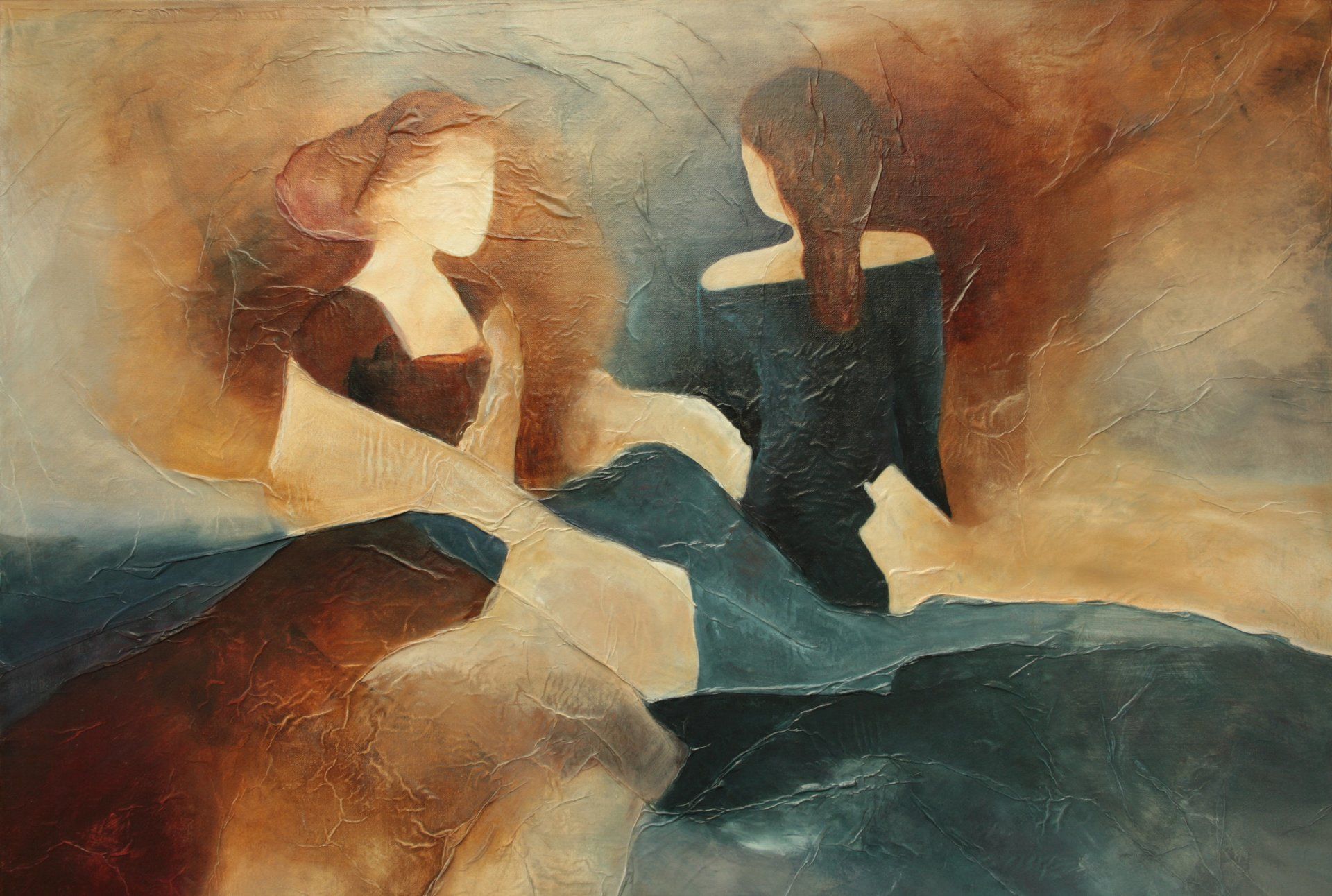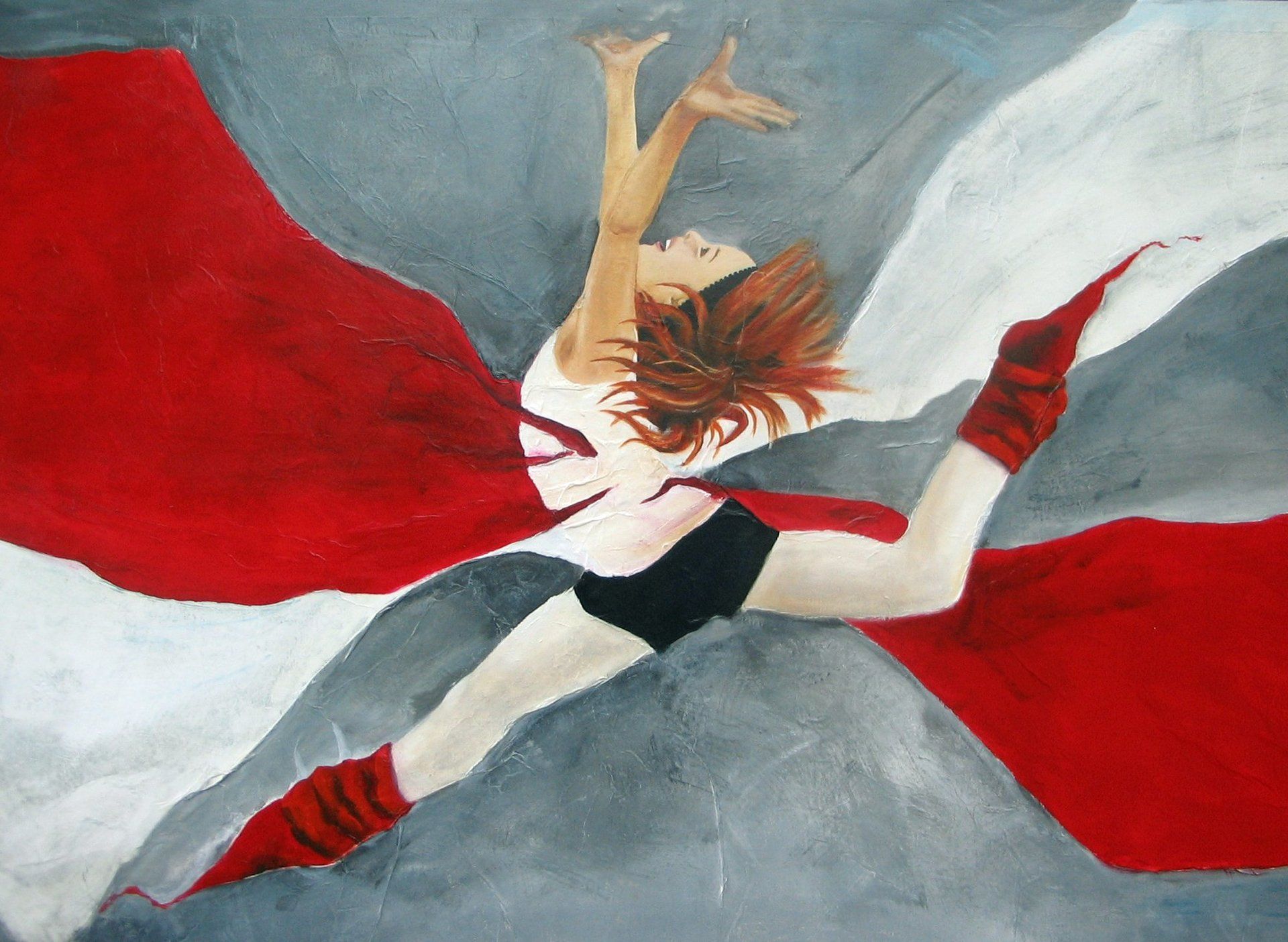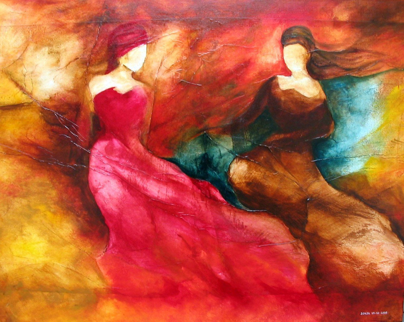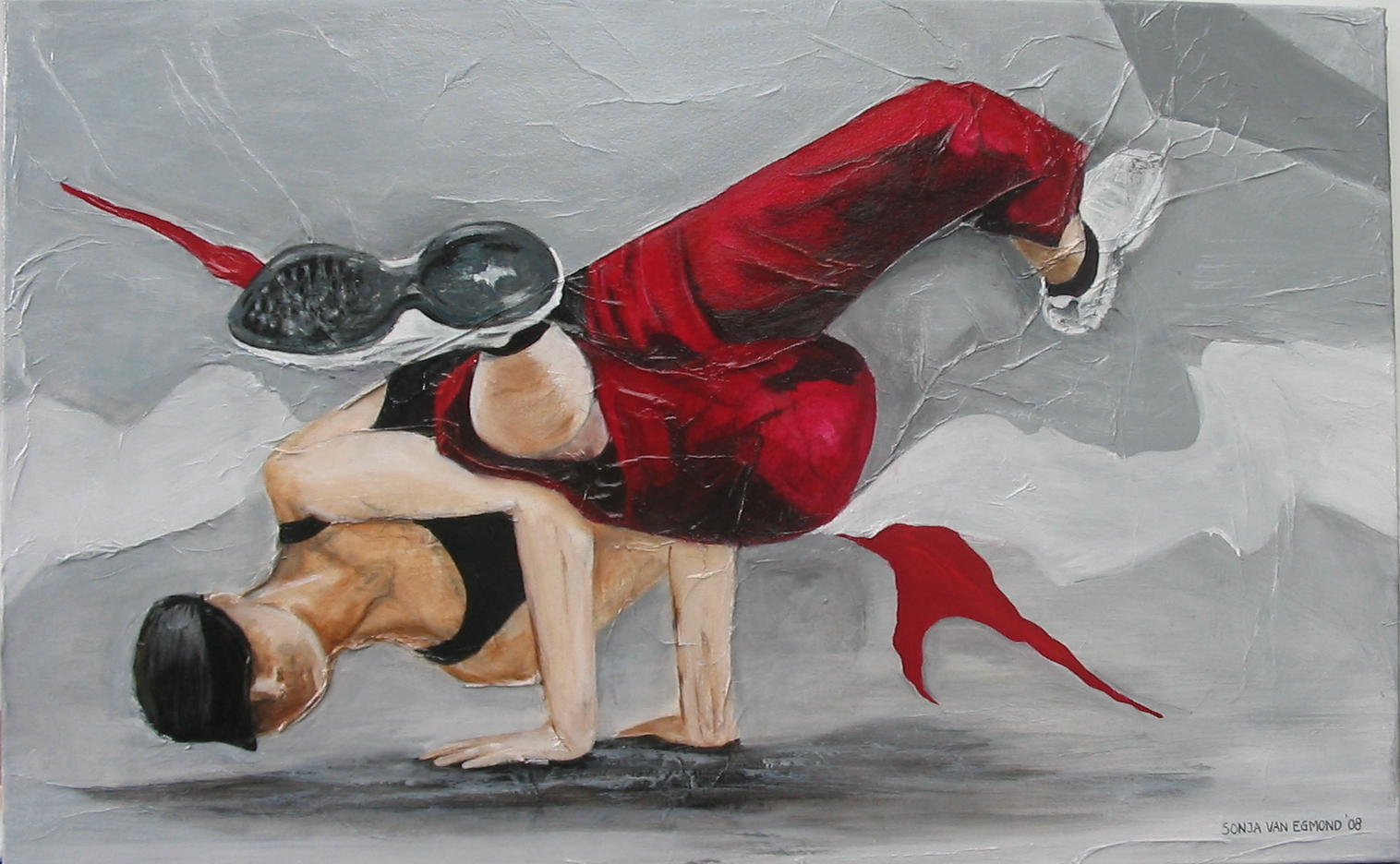 Mensfiguren geabstraheerd of juist figuratief. Sommige doeken zijn eerst bewerkt met vliegerpapier.